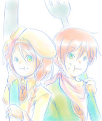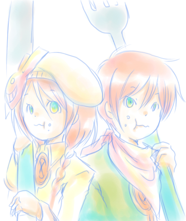 でっかい姿で描いたら、とてもシュールな絵となりました。懐かしき、Guten Apptit!の双子です。が。この本持ってる方、殆ど居ないんじゃ…?本を作るとデータ消去してしまうので、手元には自分用しかありません;紙媒体で楽しんで頂きたいので、サイト上に載せる事もありません。もし「完売した本が見たい」って方が居ましたら買う事は出来ませんが、閲覧が出来る様に本をイベントに持って行くようにしますので、仰って下さいね。※面倒臭がりなので、言われなかったら持って行きません ものぐさで、ごめんなさい(^^;